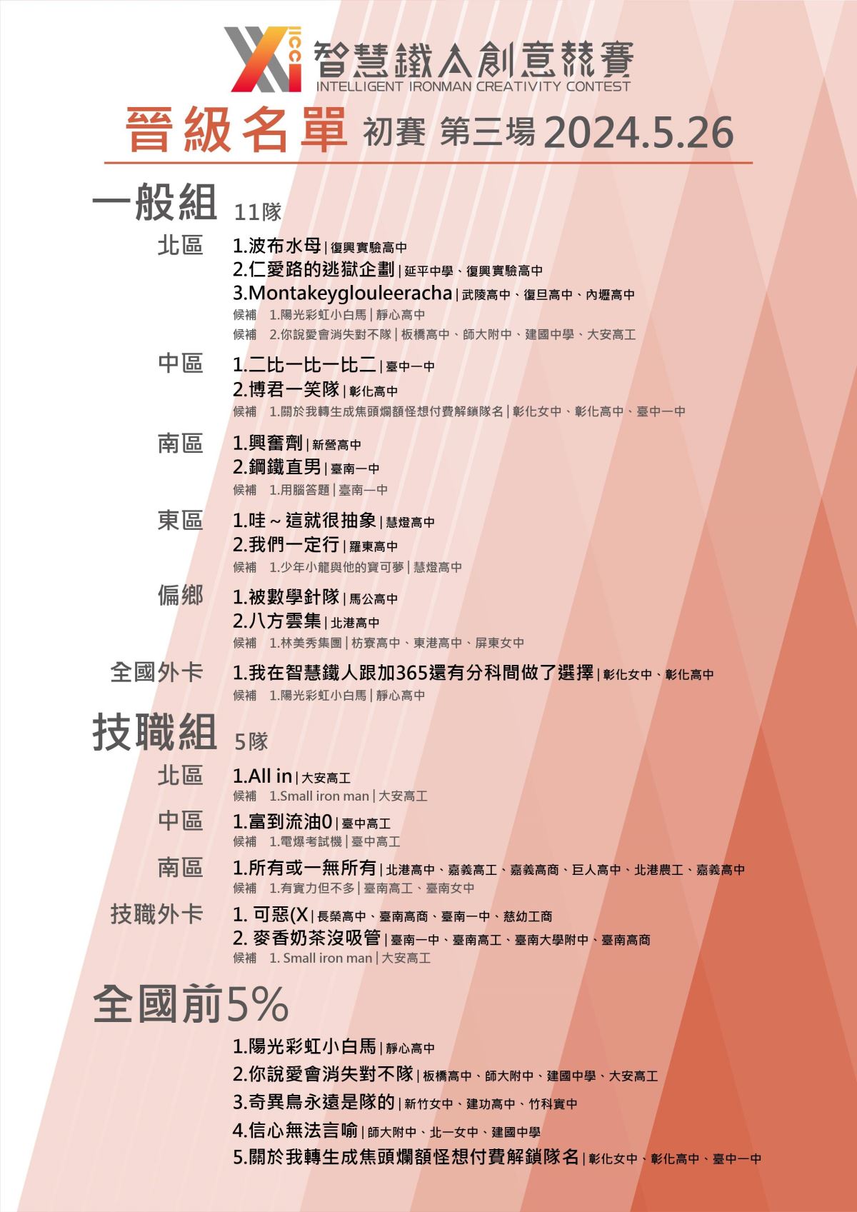 恭喜所有晉級的小隊!請所有晉級隊伍於4月18日12:00起至4月25日18:00之前,從報名系統確認是否參加複賽。並於5月11日18:00前填寫或上傳複賽所需要保險/隊伍資料。