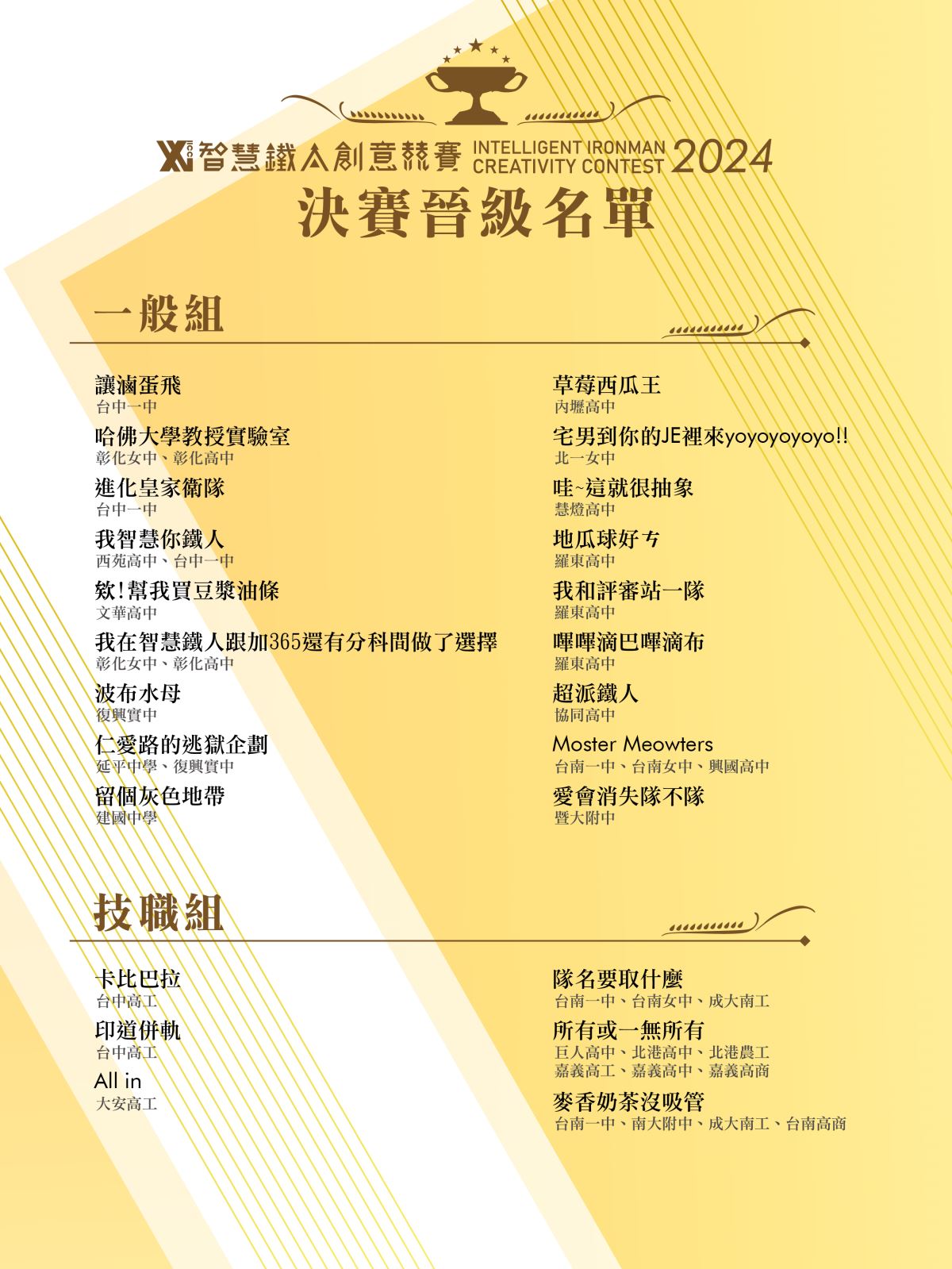 恭喜所有晉級的小隊!請所有晉級隊伍於3月7日12:00起至3月14日18:00之前從報名系統確認是否參加複賽並於3月30日18:00前上傳複賽資料。